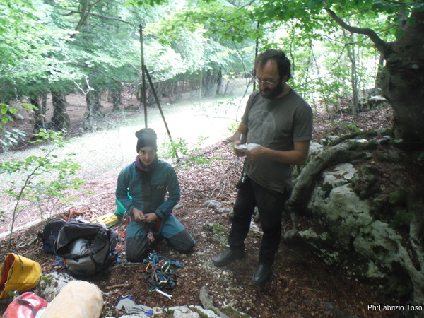 Ce n’e’ uno di partenza e subito sotto un altro. Il secondo decidiamo di utilizzarlo come deviatore. Oggi mi sono vestito leggero, improvvisamente sento molto freddo. Chiedo a Valentina se sa l’ora, “Saranno le 2”, mi risponde. E’ l’ora buona per fare pausa per uno spuntino. Dividiamo da bravi amici il suo panino ed un sorso d’acqua. Il senso di freddo non e’ passato, pero’ mi sento meglio.