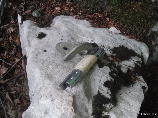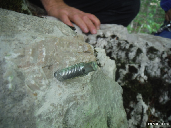 Fatto il buco, monto sul trapano il bussolotto per mettere in sede il multimonti-fix. Entra e si impana nella roccia senza particolari problemi