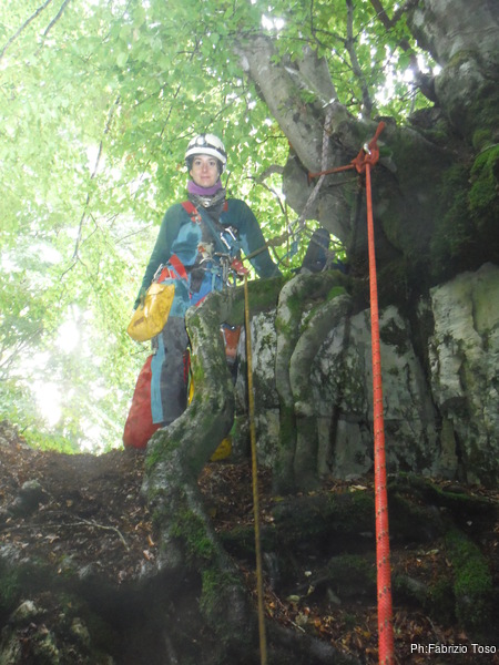 Dopo le appassionanti prove, iniziamo l’armo dall’albero. Fatto questo, Gabriele e Giuseppe ci lasciano e se ne vanno a fare il loro giro. Valentina ed io rimaniamo a divagarci con la Creta Rossa. Armeremo 2 vie, una Valentina ed una io. Annoio adeguatamente Valentina con qualche nozione di armo e poi le appioppo tutti i pesi bardandola come un albero di Natale. Inizio a scendere.