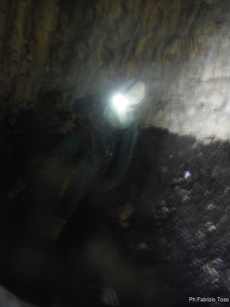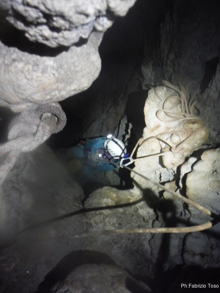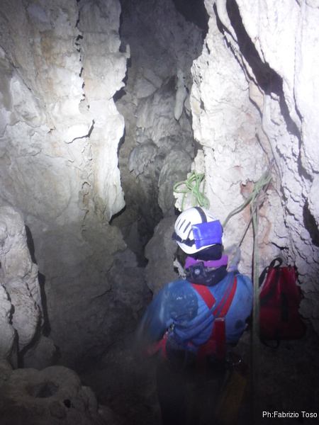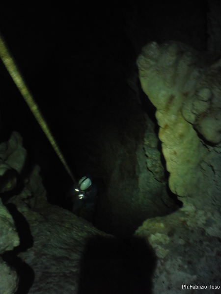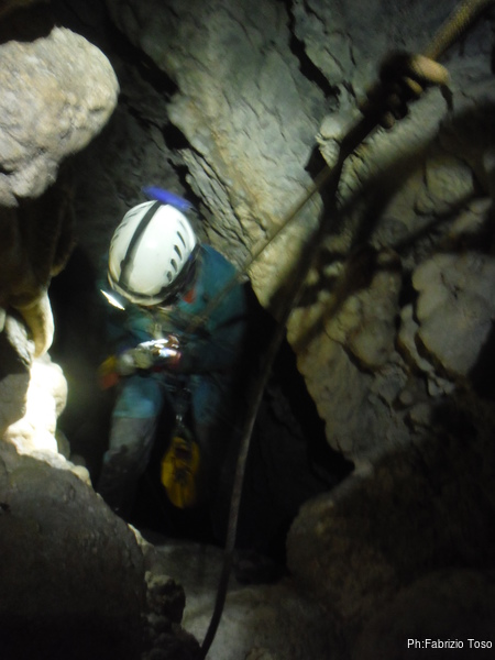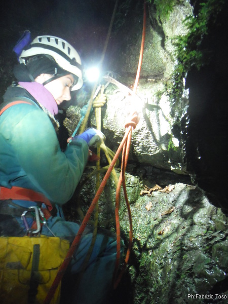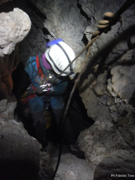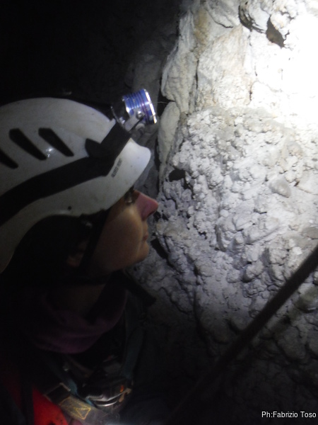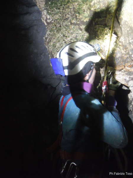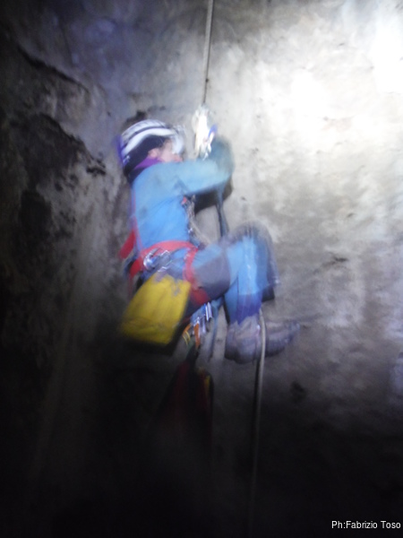 Mi raggiunge Valentina. Dove il pozzo “spancia”, inizia il nostro lavoro. Non e’ semplice per nulla, la roccia e’ pessima in questo punto. Per i primi 2 frazionamenti ce la caviamo, io con dei fix, Valentina invece utilizza uno spit. Visto che il suddetto spit e’ lercio ed intasato, Valentina ha anche l’occasione per fare conoscenza ed utilizzare il “bullone disgorgatore” che abbiamo portato proprio per questa evenienza. Per il frazionamento successivo, quello che poi ci permettera’ di arrivare fino a fine pozzo, dobbiamo lavorare duramente tutti e 2 per trovare un punto adatto e prepararlo come si deve.