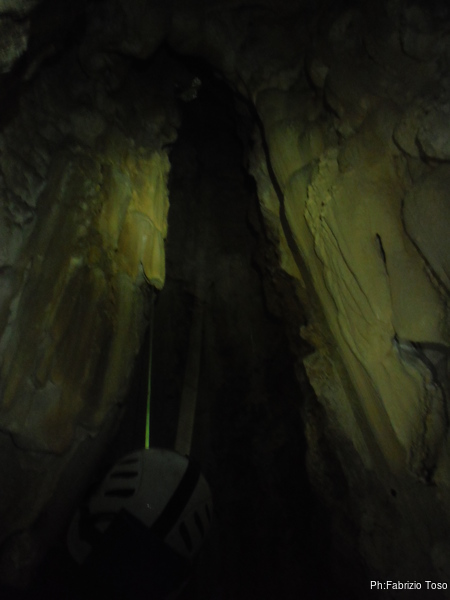 Finalmente al fondo del pozzo. Siamo nel punto dove la grotta si divide in 2 rami. Uno che prosegue sulla verticale del pozzo appena scesa e l’altro ramo di lato, a qualche metro. Decidiamo di provare il ramo laterale.