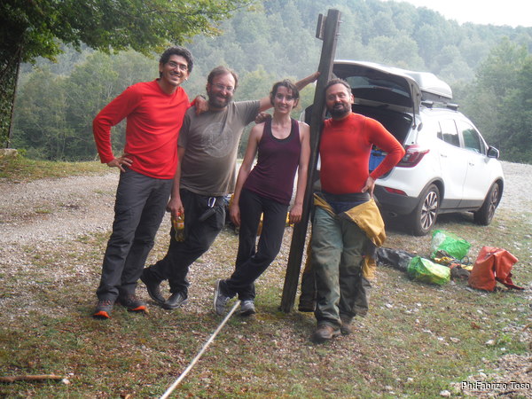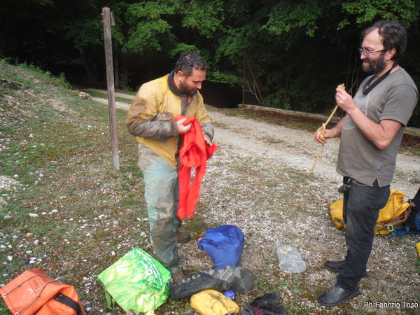Mentre ci cambiamo, ci scambiamo informazioni, noi raccontiamo la nostra avventura d’armo e loro ci dicono della gita al Cavorso. Chiediamo l’ora, sono le 6 e mezza del pomeriggio! Ancora un poco e avremmo fatto tardi per la riunione. Praticamente quando Valentina ha stimato essere le 2, erano almeno le 5. Non ci siamo resi conto che tra un giro e l’altro, le prove del multimonti-fix, la pioggia e gli spiegoni sull’armo, siamo entrati in grotta alle 3 del pomeriggio.