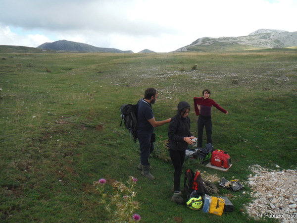 Ho portato il gps, lo cedo a Gabriele cosi’ che possa prendere il punto dell’inghiottitoio di Campocatino. Angelica scende a fargli compagnia.