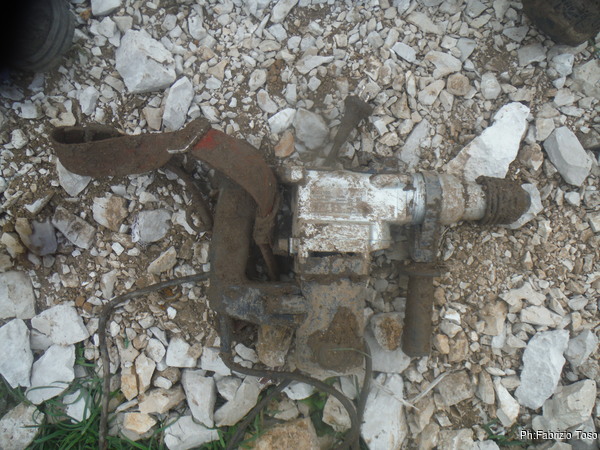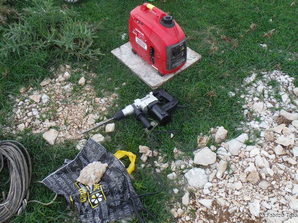 Facciamo le prove di rito prima di entrare. Il generatore parte subito senza problemi. Il demolitore attaccato direttamente al generatore funziona correttamente. Purtroppo la prolunga sembra avere qualche problema. A prima vista sembra tutto a posto, ricordo pero’ che la volta scorsa la ciabatta aveva un interruttore che faceva le bizze. Lo smonto ed isolo l’interruttore. Ora e’ tutto a posto, possiamo entrare.