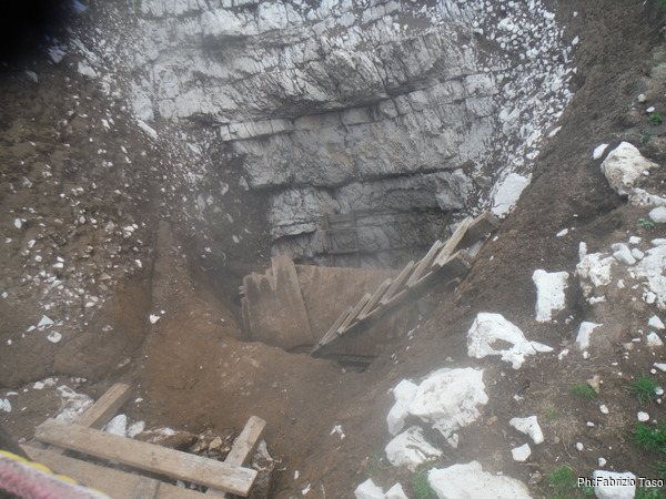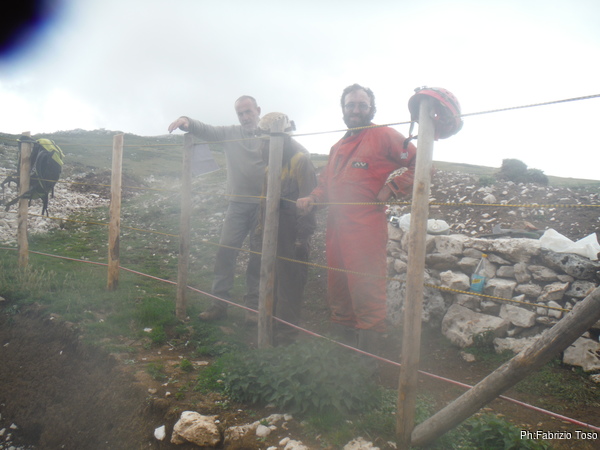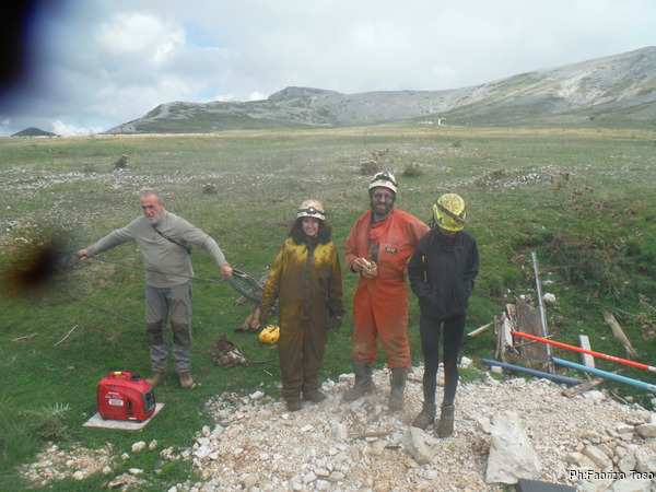 Con Valentina facciamo ancora un poco di lavoro per spianare un punto stretto del cunicolo che porta al fondo attuale della grotta. Lo facciamo in previsione dei prossimi lavori in maniera che i secchi passino senza intoppi. Fatto il nostro, usciamo anche noi. Fuori, insieme ad Angelica troviamo anche Gabriele e Gianluca.