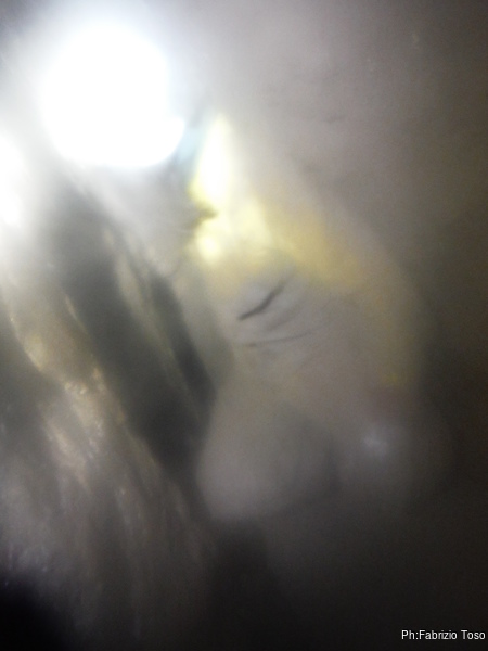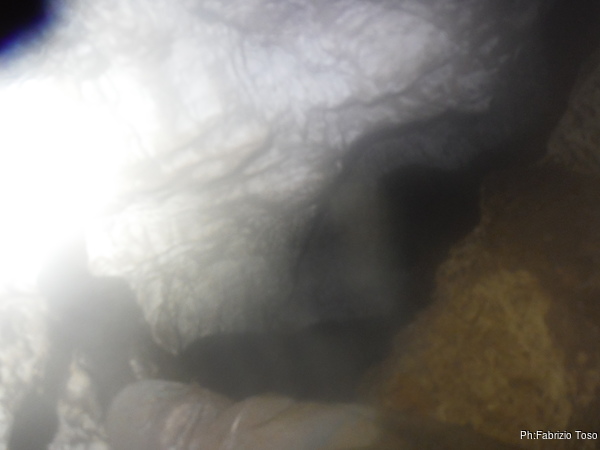Andiamo un poco in giro a curiosare, del fango ci importa poco, ne abbiamo gia’ tanto sulla tuta. Il punto dove l’acqua viene assorbita e’ molto interessante, pero’ e’ sovrastato da una colonna di sassi di crollo. Quando mi decido a documentare e’ troppo tardi, oggi non c’e’ per nulla circolazione d’aria e siamo circondati dalla nebbia. Questo e’ il misero risultato del mio tentativo.