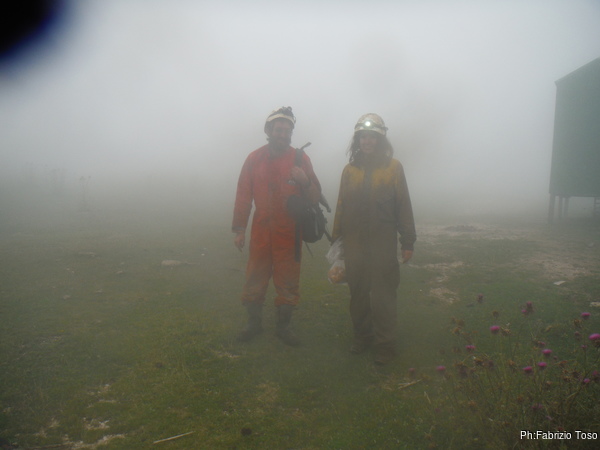Il ritorno e’ tranquillo, scesi di quota di qualche metro la nebbia scompare. In pratica eravamo letteralmente tra le nuvole. Una bella giornata con pure un paio di metri di esplorazione ed un’altra strettoia per sognare mirabolanti prosecuzioni. Alla prossima.
