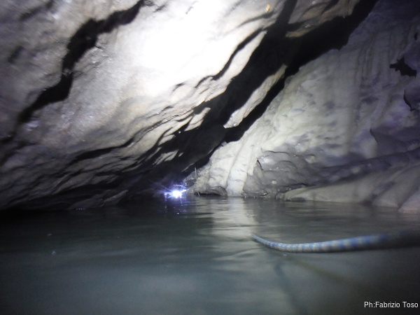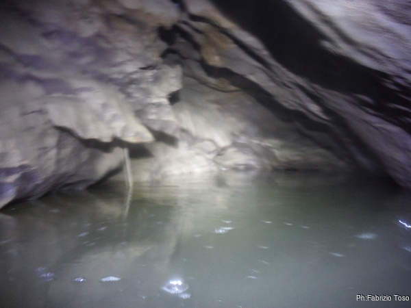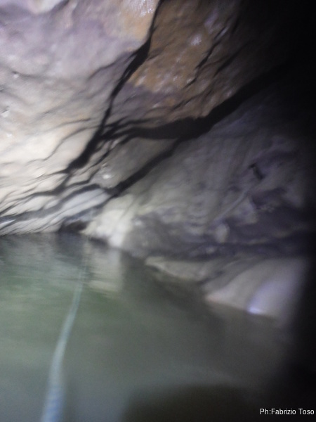 Urlo ai miei amici di venire avanti. Intanto passo oltre per vedere la situazione. I miei peggiori sospetti vengono subito confermati. L’acqua e’ altissima, almeno un metro piu’ delle volte scorse. Vado alla parete di fondo nel punto dove so esserci il passaggio. Lo trovo, e’ giusto all’altezza del mio stinco. Oggi non passeremo.