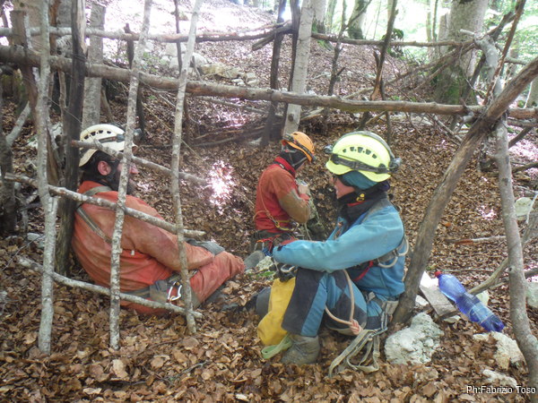 Nel cercare di vestirmi per la grotta scopro di aver dimenticato i pantaloni. Mentre mi dispero lamentando l’inizio di demenza senile, che evidentemente comporta queste situazioni incresciose, viene in mio soccorso Angelica. Ha portato un paio di pantaloni in piu’. Li provo con poca speranza possano entrarmi, e invece no! Sono un regalo di suo fratello ed inoltre sono elasticizzati. Riesco a comprimermici dentro senza troppa fatica. Risolto il problema, termino di prepararmi. Ad ora di pranzo siamo davanti all’ingresso pronti per la nostra avventura. Oggi abbiamo in programma di fare foto, di quelle belle, e di fare una piccola risalita alla base del primo P50. Ci dividiamo in 2 squadre. Angelica ed io entreremo per primi per andare a fare la risalita. Gabriele e Giuseppe faranno le foto iniziando dall’ingresso fino alla partenza del P50. Fatte le foto, Gabriele tornera’ fuori e Giuseppe ci raggiungera’ per andare a lavorare alla strettoia del ramo laterale. Fatti i nostri piani di massima per la giornata, Giuseppe sistema la corda d’ingresso e partiamo.