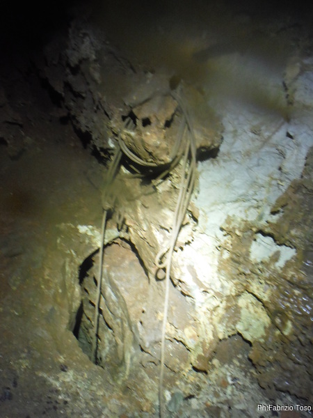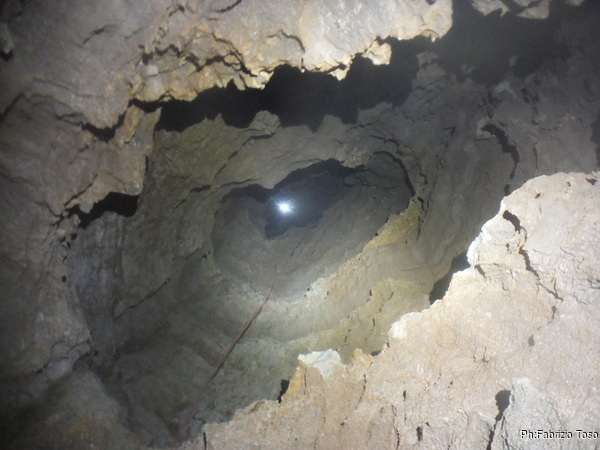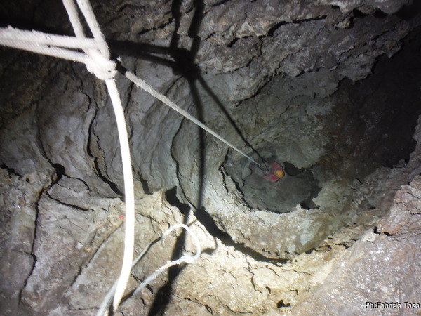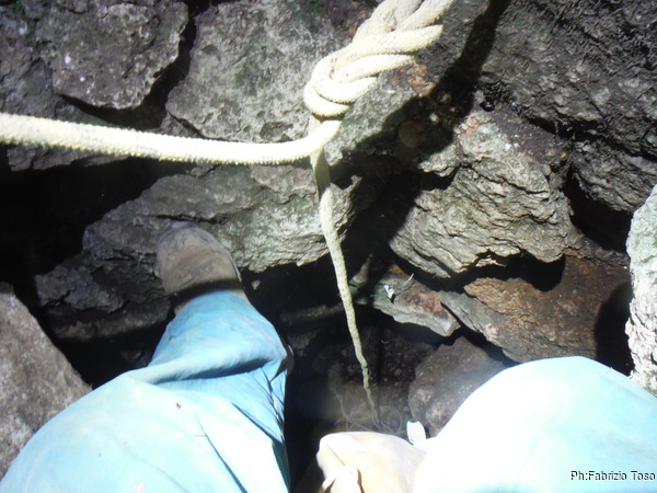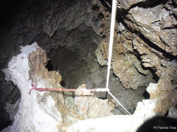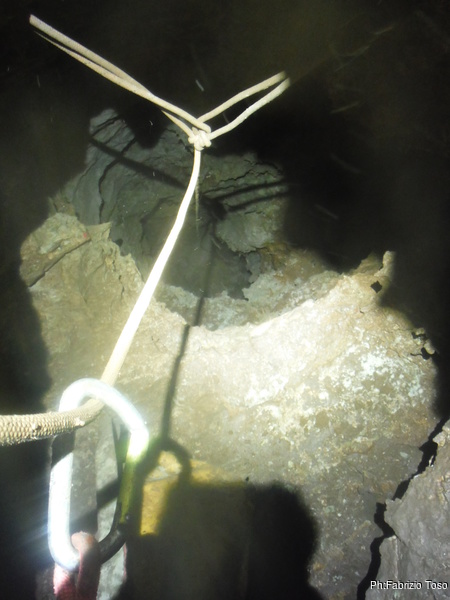 Entro per primo. Visto che e’ un po’ che non vengo, ho piacere di fare le foto ad ogni pozzo. Questo e’ il primo, quello d’ingresso. Prima quasi non lo consideravo un pozzo poiche’ dopo 4 metri c’era un terrazzino che portava alla saletta sotto. Ora, dopo un paio d’anni di terra e detriti, il terrazzino si e’ trasformato in uno scivolo che rende consigliabile l’uso della corda fino alla saletta dove inizia il pozzo successivo.