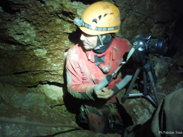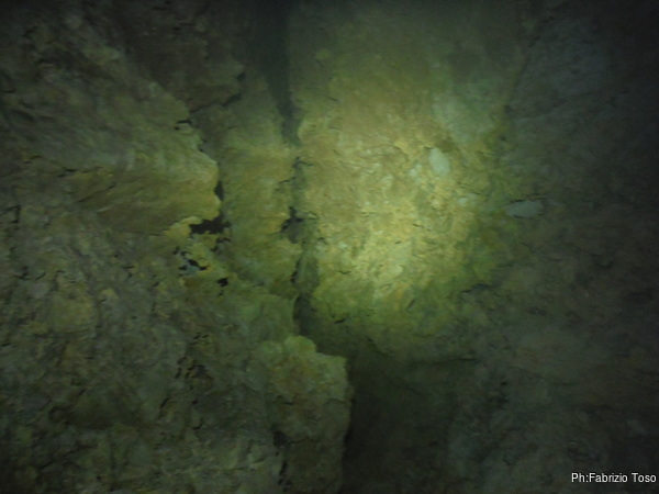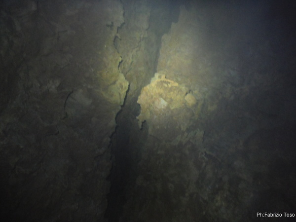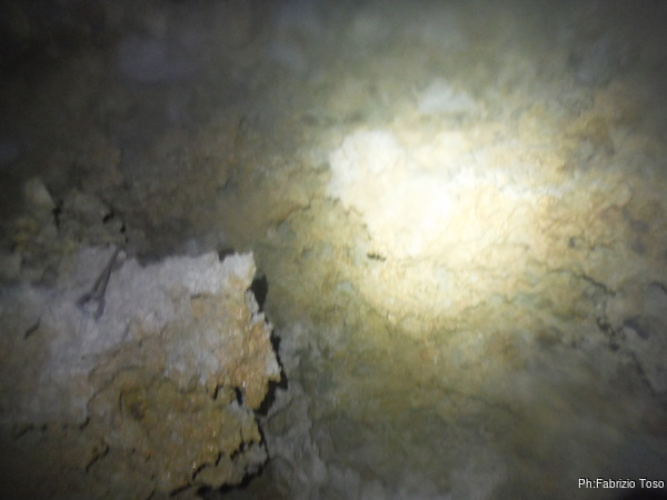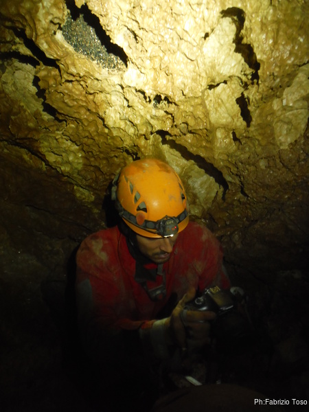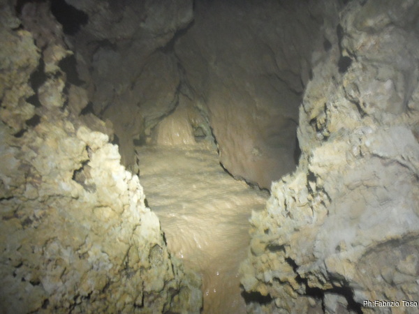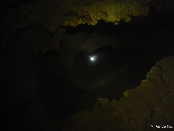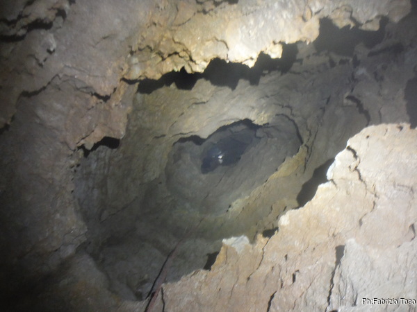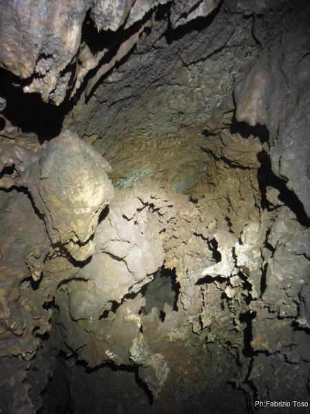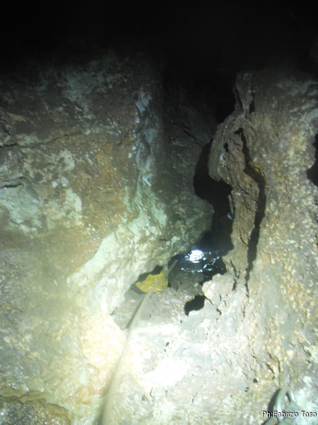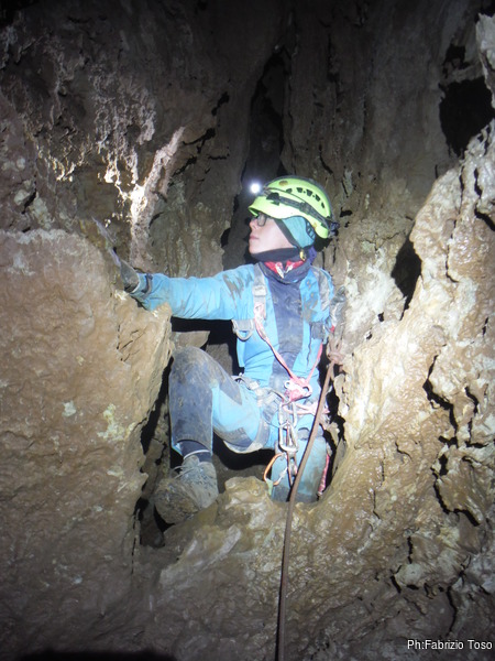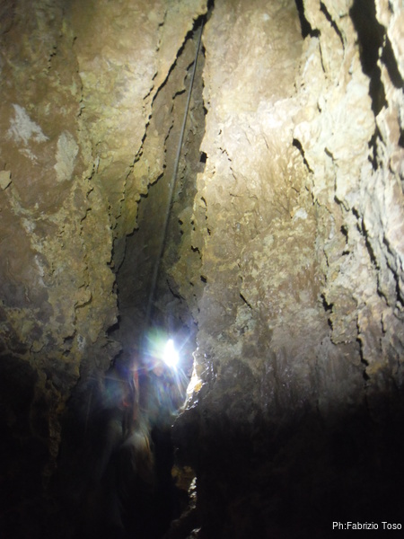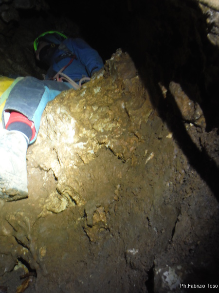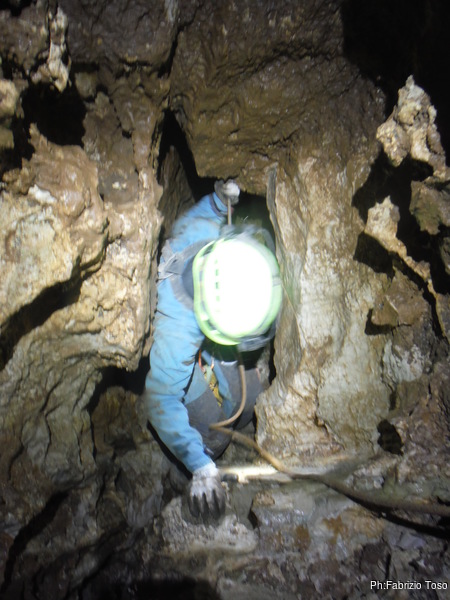 Mentre stiamo valutando se e’ possibile passare la strettoia che ci preclude la vista dell’ambiente che si intuisce subito dopo, arriva Giuseppe. Mentre e’ ancora su corda, ne approfitto per chiedergli di guardare, dall’alto, nel caso ci fossero passaggi piu’ agevoli di quello che stiamo valutando noi. Pare che anche lui non trovi di meglio. Angelica fa un primo tentativo di passaggio ma la strettoia si rivela stretta anche per lei. Tanto per dire, a me ci entra un braccio e avanzano non piu’ di 3 dita di spazio. Giuseppe ci passa il necessario per allargare e lavoriamo di buona lena per circa un’ora. I nostri sforzi vengono ripagati. Al secondo tentativo Angelica riesce a passare e va in esplorazione. Le passo la fotocamera per documentare quel che trova. Vi lascio con le sue foto.