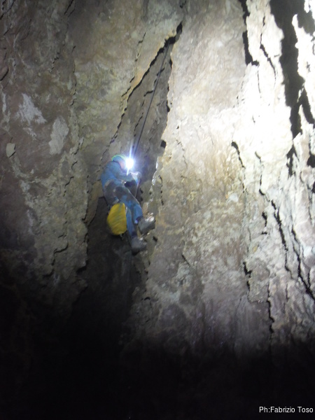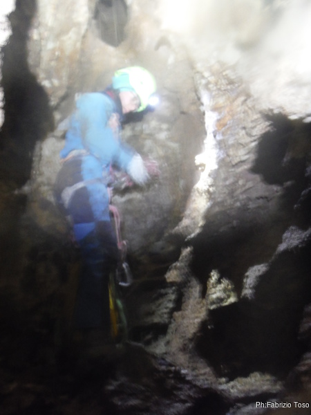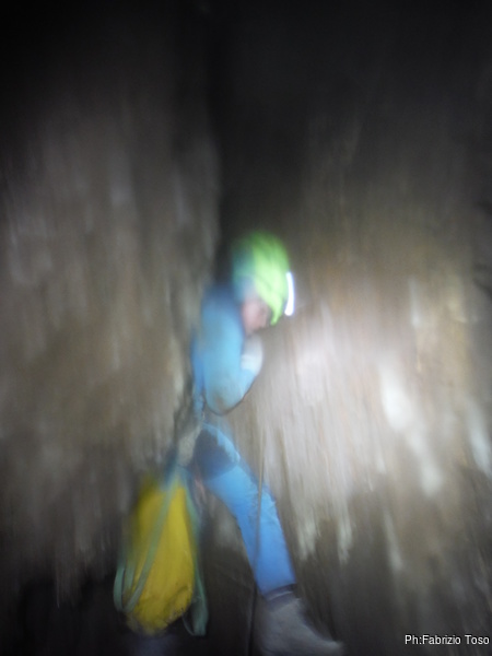 Riponiamo le nostre cose negli zaini e prendiamo la via del ritorno. Giuseppe parte per primo perche’ vuole fare delle foto mentre noi risaliamo il P50. Come seconda parte Angelica ed io rimango solo soletto ad aspettare il mio turno. Con Angelica saliamo ad un frazionamento di distanza, oramai il P50 e’ abbastanza pulito da permetterlo. Ad ogni modo al frazionamento intermedio mi sistemo di lato in un punto al coperto.