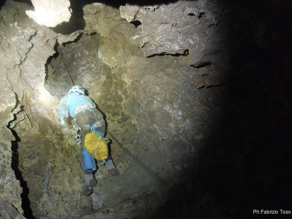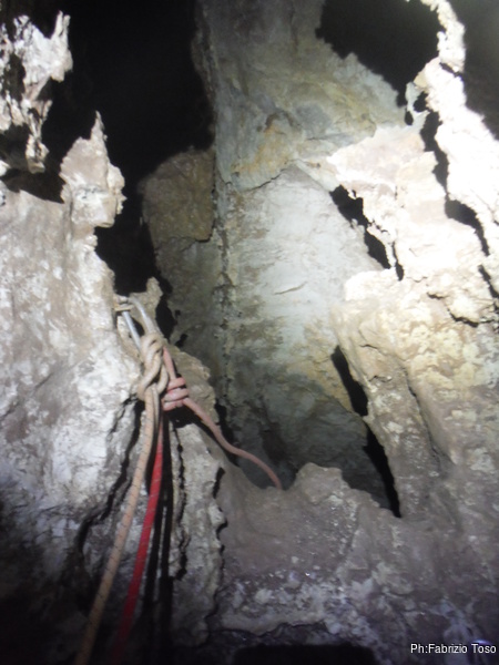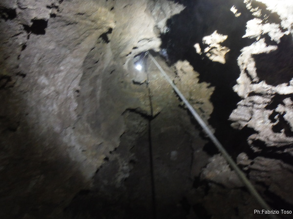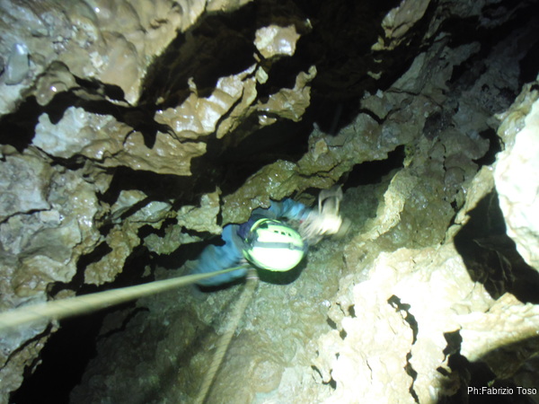 Subito decidiamo che non sara’ lei a farmi sicura durante la risalita. Peso quasi il doppio di lei! Per partire con la risalita utilizziamo 2 attacchi a parete. Probabilmente erano stati messi come partenza del P50 successivo. Metto la corda e vado col primo fix. Proseguo salendo a piccoli tratti, Angelica attende con pazienza. Mentre salgo cerco di raccontarle quel che faccio. Arrivato all’altezza utile guardo sopra di me nel caso ci fossero passaggi piu’ ampi. Non mi pare. L’ultimo tratto, praticamente orizzontale lo passo utilizzando un armo naturale. Un ultimo sbuffo e sono sul terrazzino, ben sopra le stalattiti. Sistemo l’armo per la risalita, ripulisco di qualche sasso in bilico ed invito Angelica a salire.