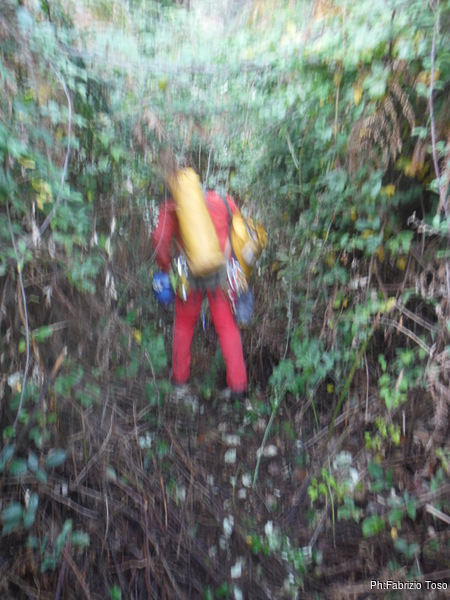Stefano e’ pronto da un poco e scalpita per fare qualcosa. Gli affidiamo tutti gli zaini del materiale e lui si avvia verso la grotta. Iniziera’ ad armare. Finisco di prepararmi, lascio a Stefano, l’altro, il compito di governare i nostri corsari e seguo Stefano, quello coi zaini, verso la grotta. Strada facendo qualche fungo mi costringe ad una sosta.