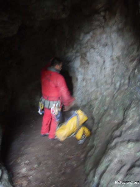 Tanto per distinguere uno Stefano dall’altro, oggi saranno Stefano alto, che e’ rimasto alle macchine e Stefano armante, visto che si occupera’ dell’armo della grotta. Riprendo Stefano armante ad un centinaio di metri dall’ingresso. Mi guardo bene dal liberarlo degli zaini, ma in compenso lo allieto con il racconto dei miei molti acciacchi.