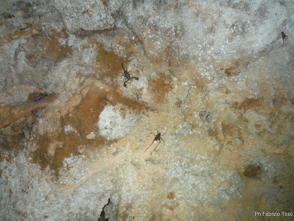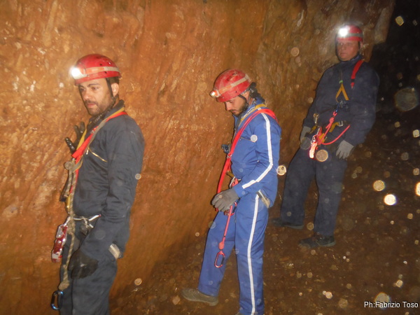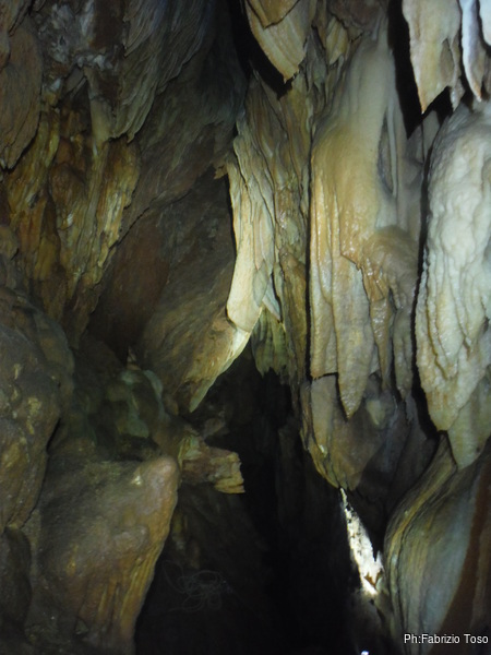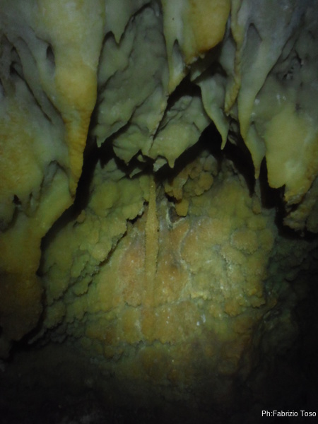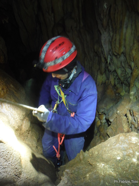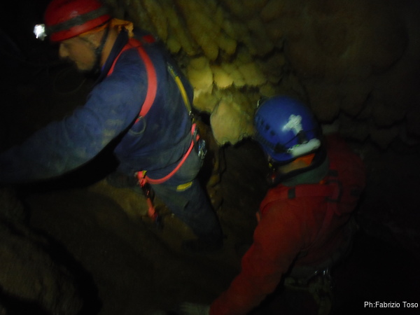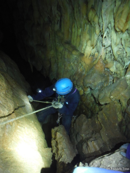 Scendo per primo e mi fermo alla base del pozzo a fare sicura. Scende Claudia, le presto la fotocamera per fare delle foto a delle escrescenze dorate che vede sulle pareti e la incuriosiscono.