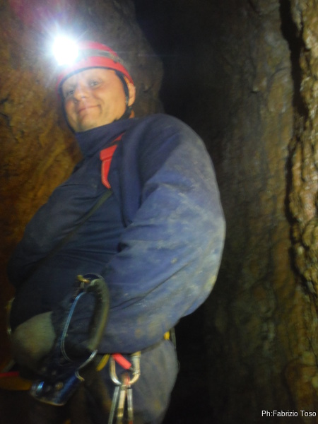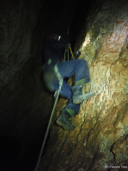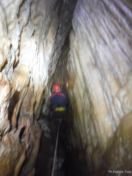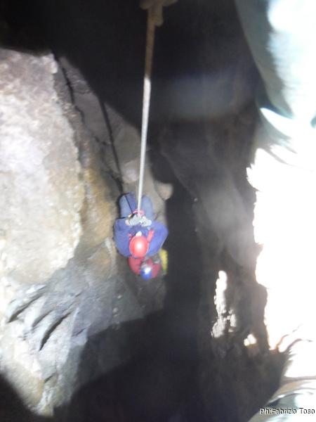 Fatto un frugale pasto in “sala da pranzo”, iniziamo a scendere. Stefano alto scende giu’ ed io mi metto alla partenza del pozzo.