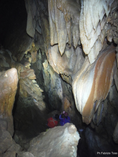 Posso riposarmi poco, un paio dei nostri corsari sono iperattivi e dopo aver chiesto, partono all’esplorazione del meandro che sale dalla “sala da pranzo”. Con un sospiro mi tiro su dal mio sedile improvvisato e li seguo.