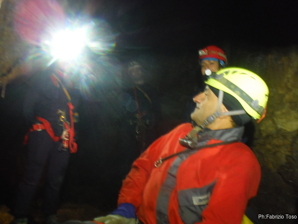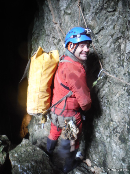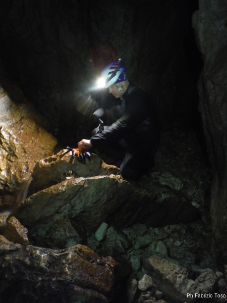 Entriamo in grotta. Max inizia ad armare il primo saltino. Noi aspettiamo pazientemente sotto un intenso stillicidio. Ne approfittiamo per dare un’ultima controllata alle attrezzature.