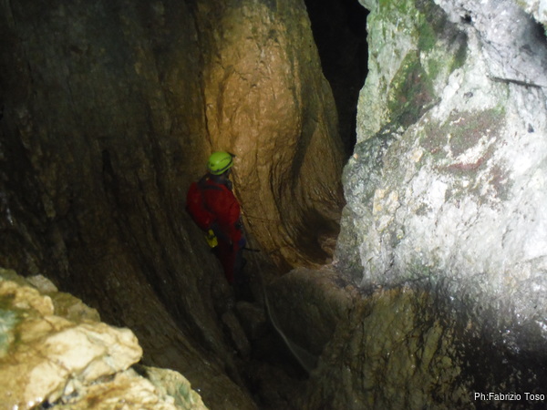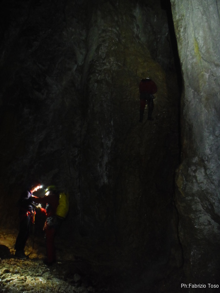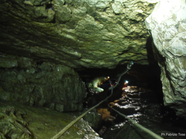 Il pozzo successivo ha una variante rispetto all’armo classico. La corda gira di lato a destra verso la parete verticale e subito dopo c’e’ un frazionamento che permette di evitare l’acqua.