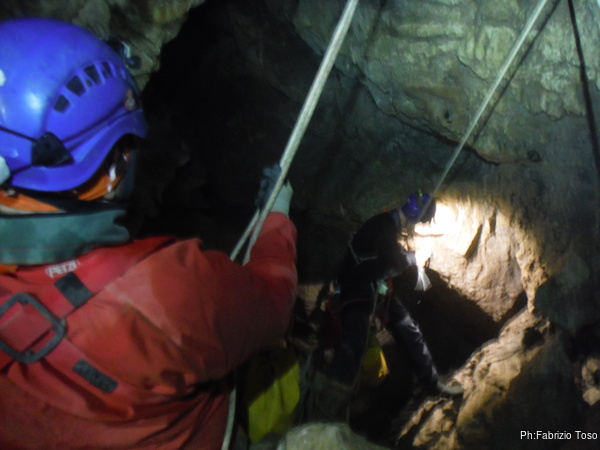 In men che non si dica siamo alla partenza del P19. Max e Stefano stanno ultimando l’armo. Visto che questo e’ il pozzo piu’ lungo affrontato finora, hanno sistemato due corde, una con il classico deviatore vicino alla partenza ed una con frazionamento a meta’ discesa.