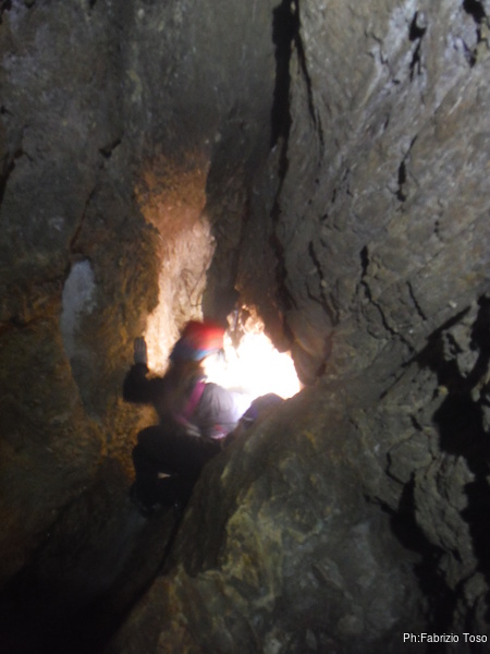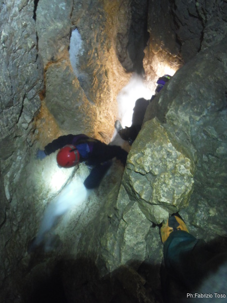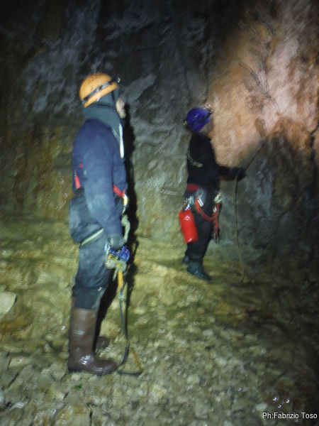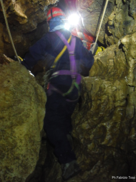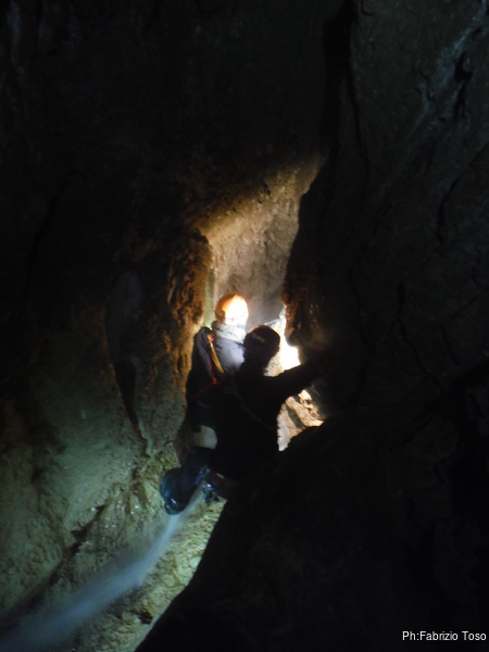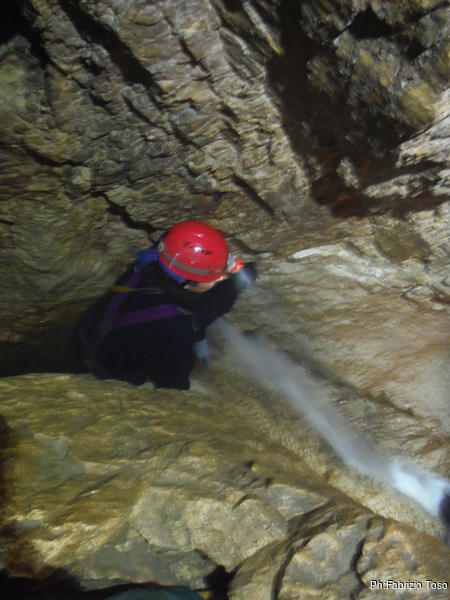 Per scendere dal mio trespolo, aspetto che arrivi Fabio, voglio confrontarmi con lui su alcuni aspetti della didattica in grotta. Intanto sotto Stefano porta i nostri corsari al prossimo cimento. Appena Fabio ed io abbiamo terminato, li raggiungiamo. Siamo alla “pozza bastarda”. Non troverete il toponimo da nessuna altra parte, e’ una cosa mia personale. La chiamo cosi’ perche’ ogni volta mi costringe a fare delle spaccate al limite delle mie possibilita’…ed ogni tanto mi ci frega costringendomi a continuare la grotta con i piedi zuppi. Stavolta e’ Fabio ad andare avanti.