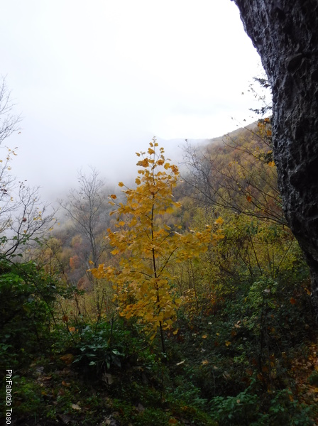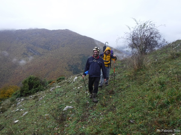Sento i miei amici chiamare per il pranzo. Scendo da dove son venuto, senza farmi pregare. Oggi ho portato i panini. Dopo il lauto pasto mostro a tutti il disegno della grotta ottenuto su Topodroid. La valle inizia ad essere nascosta dalla nebbia. Speriamo bene.