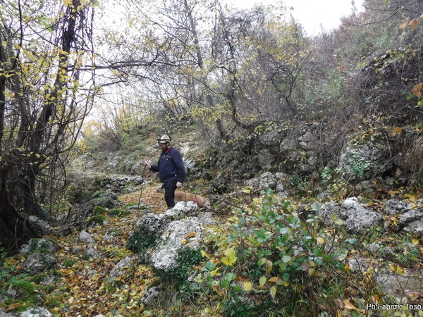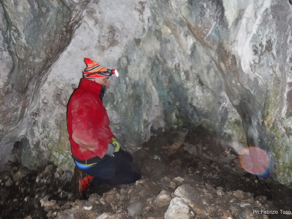 Ma dove siamo? Mi guardo attorno. C’e’ uno sgrottamento affacciato alla valle. Andando avanti si entra in una grande sala. Sulla destra si vedono altri ambienti, ma ci andro’ dopo. Nerone e’ gia’ dentro alla sala, intento a scavare in un punto dove la grotta potrebbe proseguire.