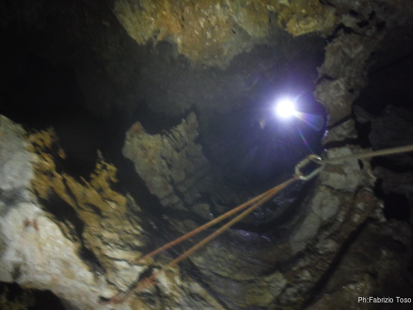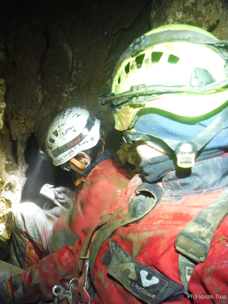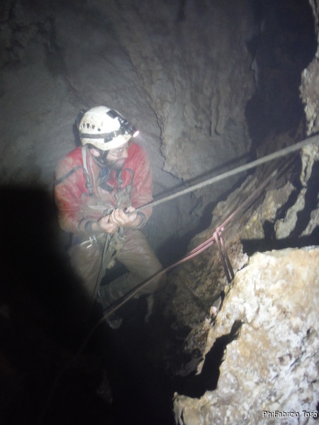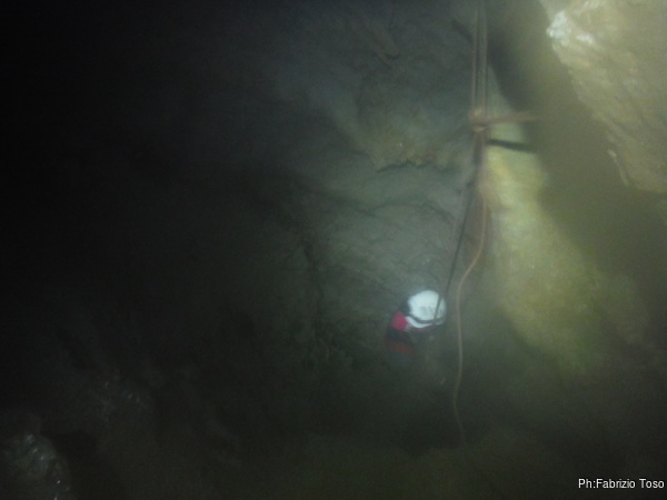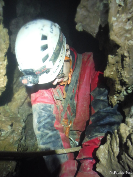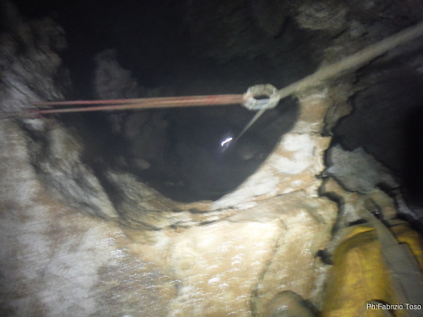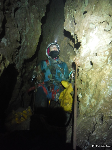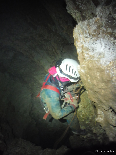 Valentina e’ alla base del P50, Gabriele finalmente arriva portando la corda. La prendo e la sistemo. Caspiterina! La corda tocca. Il deviatore che avevo predisposto non fa bene il suo lavoro. Con Angelica a farmi da assistente, riprendo il trapano per sistemare l’armo. Purtroppo questa sistemazione porta via del tempo e nel frattempo acqua e freddo non giocano a nostro favore. Fatto un nuovo deviatore, riponiamo tutto nello zaino e ci prepariamo a scendere. Per primi scendiamo Aurora sulla nuova corda ed io sulla “vecchia”. Vado avanti per farle sicura durante la discesa e per sistemare i frazionamenti anche per lei. Un intenso stillicidio ci inzuppa per benino, ma alla fine riusciamo a toccare la base del pozzo ed urlare la libera ai nostri amici. Mentre io mi riposo dalle “fatiche armatorie”, Valentina ed Aurora, risalgono a vedere la saletta nuova. Il passaggio per arrivarci e’ sempre alquanto scomodo e stretto, le sento che faticano, anche se sono entrambe di fisico minuto. Mentre tornano indietro Aurora mi strappa un sorriso quando mi chiede: “…e tu volevi passare per di qua?!?” rimanendo interdetta quando le rispondo: “Veramente ci sono passato”, omettendo pero’ di spiegarle che mi sono dovuto togliere tutta l’attrezzatura per farlo!