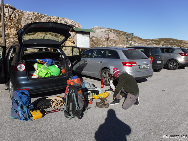 Intorno alle 10:30 (ma forse anche leggermente più tardi) siamo al parcheggio di Campocatino. Prepariamo il materiale prendendocela comoda.