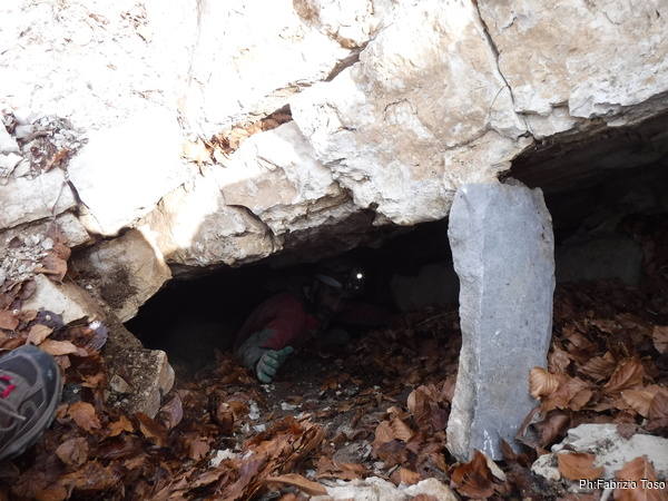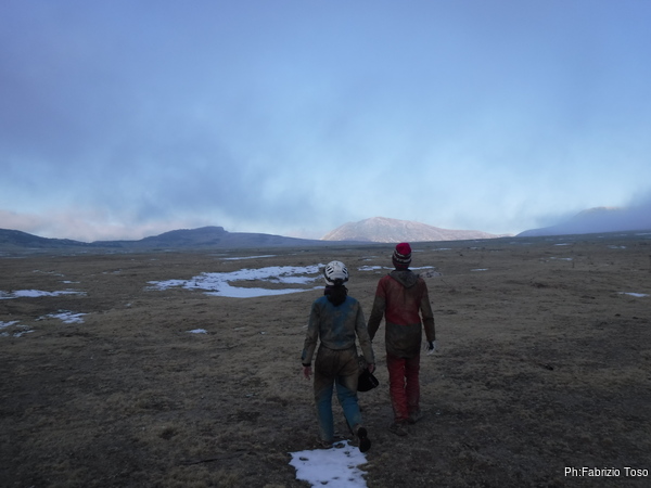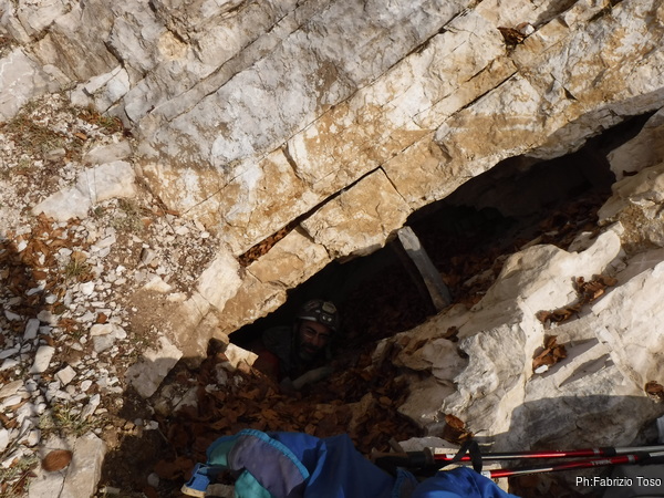 Giunti alla macchina, posiamo gli zaini ed andiamo a fare un breve giro a piedi verso due nuove grotte che Tarcisio e Gianluca (con stoica pazienza) stanno scavando da un po’ di tempo: Dolina Sfondata e Grotta Novella.