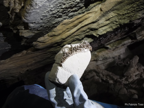 Durante la camminata che ci porta all’ingresso della grotta, rinveniamo diversi esemplari di rudiste, fossili di molluschi che, Valentina ci spiega, girovagavano da queste parti nel periodo Cretacico (o Cretaceo). Per capirci, il Cretaceo è quel periodo di tempo compreso tra il Giurassico ed il Paleogene, cioè, per renderla comprensibile a chi non sa molto di geologia, tra Jurassic Park (ca. 145 milioni di anni fa) e la grande evoluzione dei mammiferi (ca. 65 milioni di anni fa).
