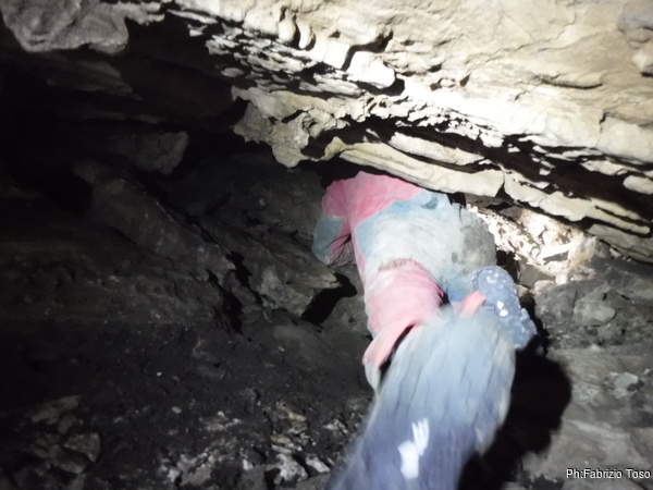 mentre io mi infilo in quello di sinistra, al quale è stata data una sola occhiata poiché inizia subito a stringersi mortalmente. Mi infilo dentro la strettoia, che soffia un leggero quantitativo d’aria, fino ad un punto in cui una lama di roccia sporgente mi impedisce di infilarmi all’interno di un oblò.