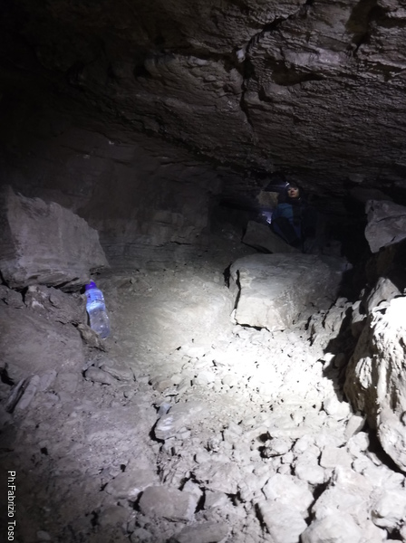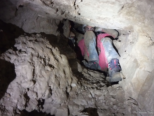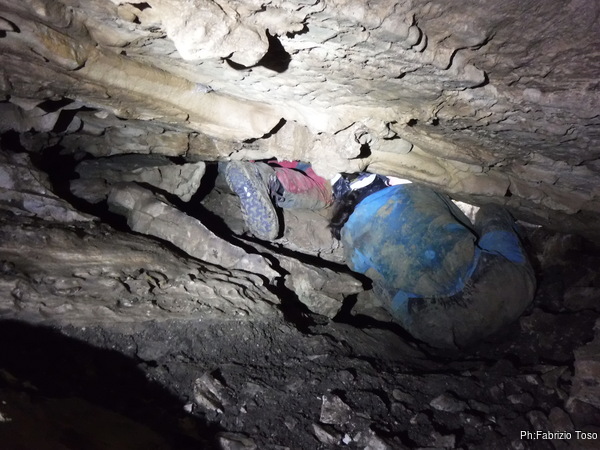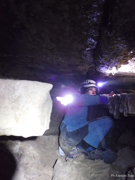 Siamo tutti e 3 nel punto iniziale, abbastanza largo da contenerci. A sinistra, per me che guardo verso l’alto, c’e’ una zona ingombra di massi. E’ stretta, quindi e’ pane per i denti di Matteo. Mentre lui si addentra, Valentina ed io continuiamo il rilievo nella parte transitabile.