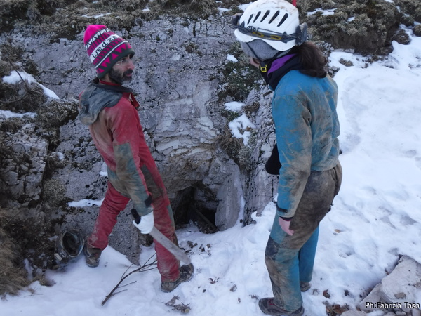 “Mi fa un po’ strano andare a Guarcino e non infilarmi nel Sistema del Vermicano”, penso mentre guido in direzione dell’uscita autostradale di Anagni. In macchina siamo io e Valentina, che ci siamo svegliati presto (neanche troppo) per raggiungere Bibbo al casello di Anagni. Appuntamento alle 9:30 per andare con una macchina sola. “Questa macchina ha la ripresa lenta”, commento insultando le automobili di marca francese. “Da 0 a 100 è lenta, poi migliora”, risponde Valentina, rannicchiata sul sedile. Non che io ce l’abbia con le macchine francesi, ma visto l’accadimento di pochi giorni dopo, anche sì. Alle 9:15 siamo al parcheggio di un albergo situato proprio davanti al casello di Anagni. Riceviamo una telefonata di Bibbo: “Vediamoci alla pompa di benzina qualche km piú su” e segue messaggio Whatsapp con posizione satellitare. Finalmente arriviamo, parcheggiamo la macchina e trasferiamo la nostra attrezzatura nella macchina di Bibbo. La scelta ricade sulla sua macchina perché c’è pericolo di ghiaccio sulla strada per Campocatino, e lui ha le gomme da neve. Sono quasi estasiato: in diversi anni di conoscenza, non avevo mai visto Bibbo guidare. A dire il vero, non sapevo neanche che macchina avesse. In una ventina di minuti siamo a Guarcino. Ad attenderci c’è Tarcisio in compagnia di Stefano Gambari (Presidente del CSR, daje Presidente!), il quale andrà a scavare in un’altra zona. Dopo una rapida colazione ed un salto al minimarket locale per comprare un pranzo frugale, iniziamo l’ascesa verso Campocatino. “Decisamente la mia zona preferita”, penso mentre procediamo lungo i tornanti che da Guarcino portano verso la nostra destinazione finale. Parte non irrilevante della mia formazione speleo è avvenuta in questa zona ed ho un legame particolare con essa, soprattutto da quando, trasferitomi nei Paesi Bassi, vedo le montagne un paio di volte l’anno. “Alla fonte qui alle Campore, durante il campo speleo del CSR del 2015, ci sono state alcune scene pietose di lavaggi dal fango delle grotte”, racconto a Bibbo e Valentina mentre continuiamo la nostra salita verso Campocatino. “E qui, all’osservatorio, c’è la strada che porta al complesso del Vermicano”. Va bene, la sto facendo lunga…fatto sta che, dopo alcuni minuti, fermiamo la macchina al bordo della strada perché incuriositi da un paio di buchi che vediamo. Piccole cosette che soffiano un po’ di aria e alle quali proviamo a dare una rapida occhiata sporcandoci ancor prima di entrare nella grotta vera e propria.