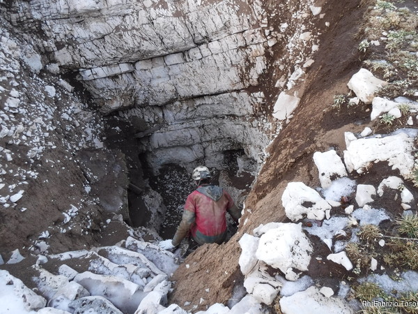 Iniziamo il rilievo con una battuta esterna alla grotta e poi ci infiliamo velocemente.