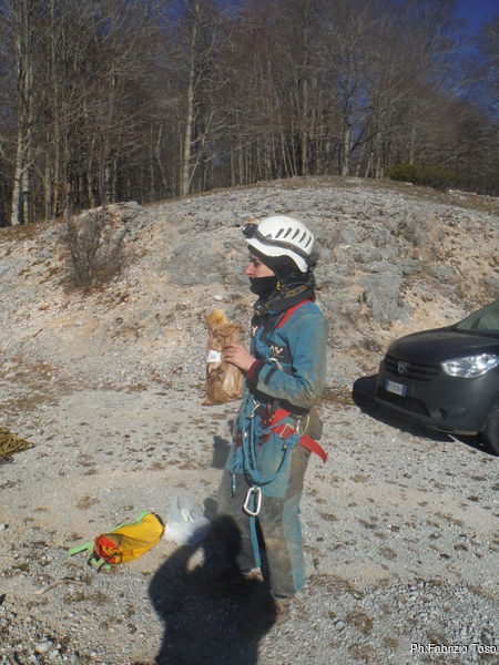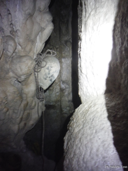 Alla fine li troviamo, Valentina sistema il tutto e scende. A meta’ pozzo la corda tocca leggermente. Lei prosegue la discesa ed arriva a fine pozzo. Quando la seguo sistemo un poco. Vicino al nodo metto un sacco vuoto sotto la corda perche’ altrimenti tocca. Mi riprometto di sistemare meglio la prossima volta. Scendo portandomi dietro un cordino e sistemo un deviatore a circa meta’ discesa. Quando arrivo giu’ noto che tocca ancora quindi urlo a Giuseppe di accorciarlo quando ci arrivera’. Mentre aspettiamo il nostro amico attenuo i morsi della fame rubando qualche morso alla pizza di Valentina.