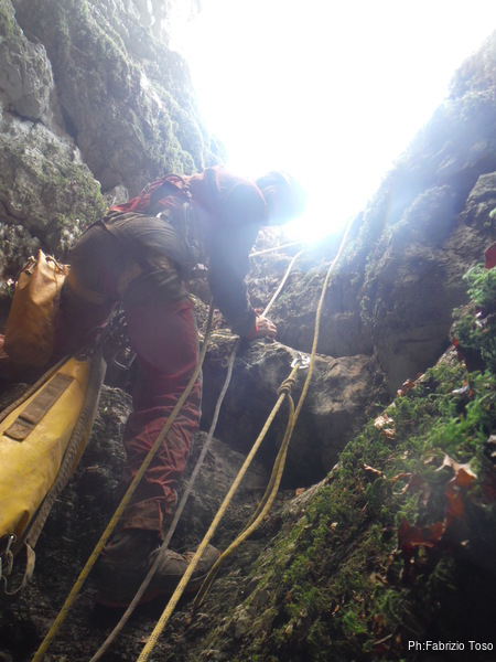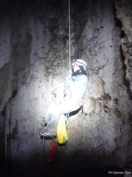 Giuseppe e’ dietro di me e lo sento risalire. Sistemo nel mio zaino tutto quel che trovo. Ora e’ pesantissimo e non mi sento piu’ in colpa per lasciar risalire Giuseppe con gli zaini delle corde.