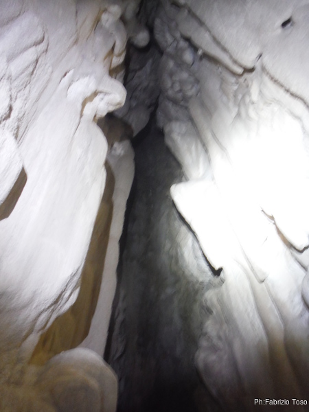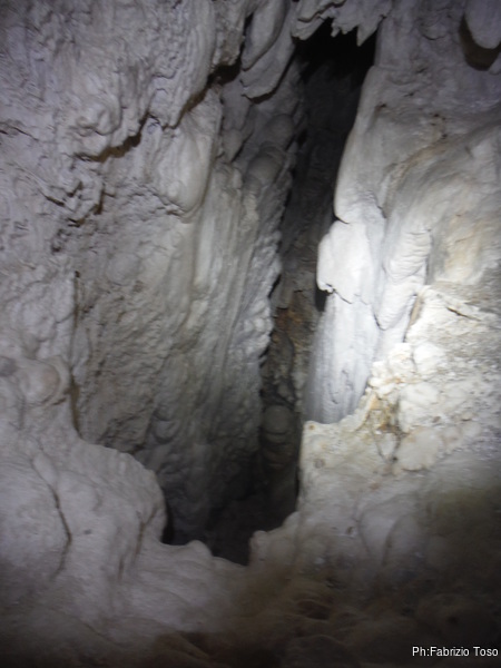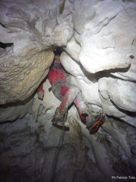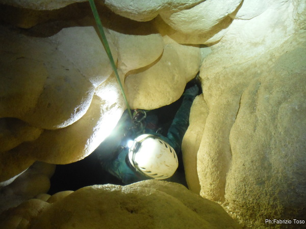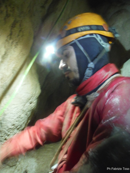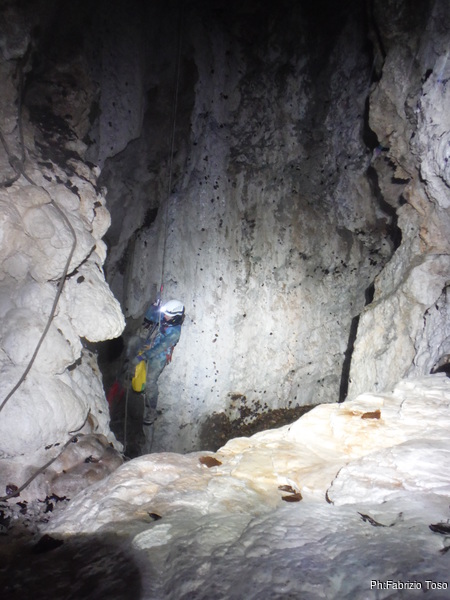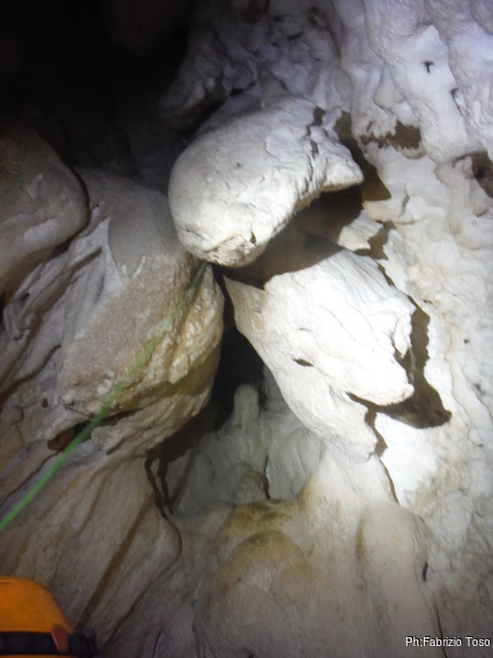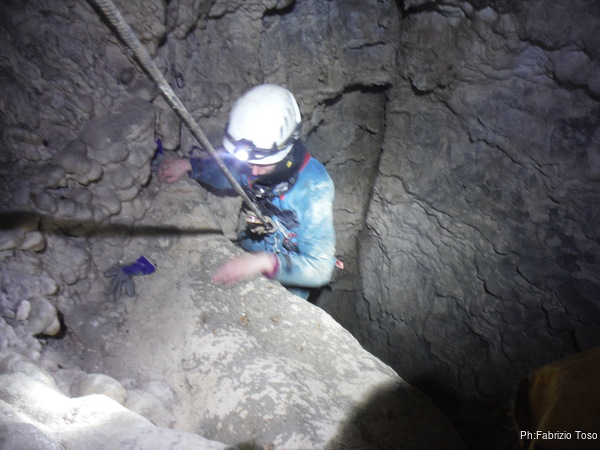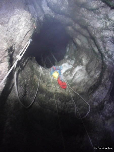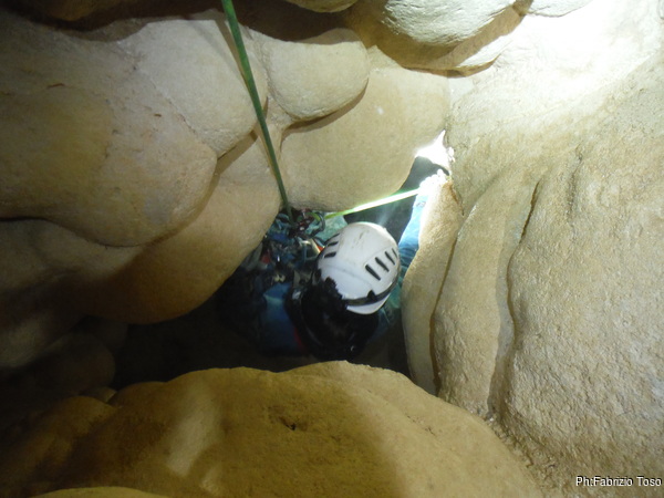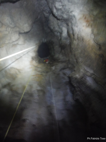 Il pozzo stavolta lo scendiamo tutti, ora siamo al punto dove ci fermammo Angelica ed io l’ultima volta. Anche stavolta le corde sono finite, ne abbiamo solo una verde che avevamo portato come cordino ma per fortuna e’ lunga poco meno di 10 metri. La prima parte del pozzo successivo e’ stretta e la scendiamo in contrapposizione. A meta’ utilizzo il nostro cordino verde su un armo naturale. Non dovrebbe essere necessario ma per prudenza lo metto. Ci troviamo cosi’ in un piccolo ambiente dove stiamo comodamente tutti e 3. Per terra si apre un buco che ci mostra un’altra sala 4 metri piu’ in basso. C’e’ uno spit. Bene, lo utilizzo. Sistemo la corda ed invito Valentina a scendere per prima.