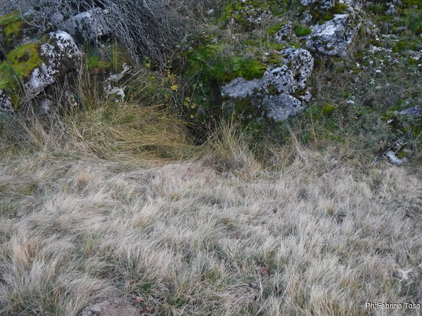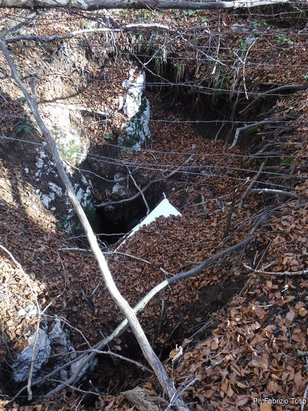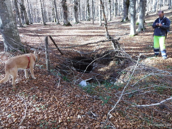 Dopo il pranzo si riparte alla volta del Pozzo della Vacca Morta. Gabriele rimane indietro a cercare altre grotte mentre Maurizio ed io arriviamo ad un buco recintato.