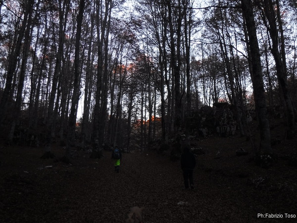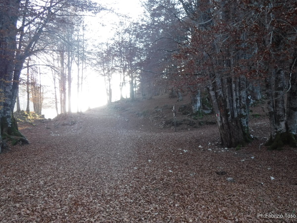 La luce nei punti di bosco piu’ fitti cala notevolmente, fa freddo. Faccio sosta per indossare la giacca a vento. Il sole incendia la punta degli alberi in lontananza.
