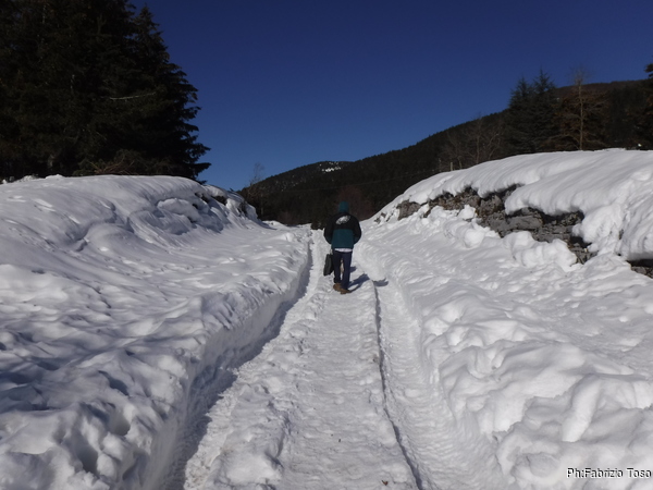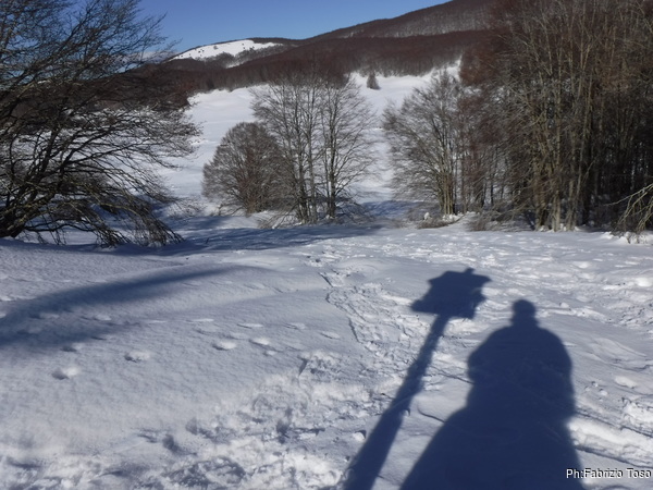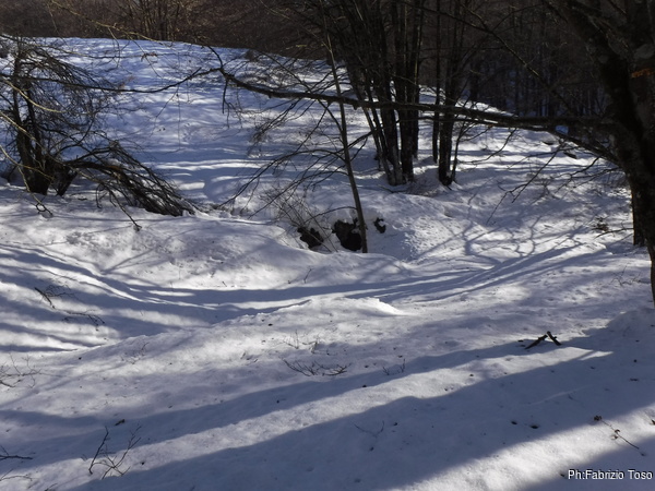 Nello scendere mi accorgo di aver fatto un errore madornale. Qua la neve e’ fonda anche oltre metro ed io ho scordato di mettere gli “ombrellini” sulle punte delle racchette. Ogni tanto, soprattutto quando ne ho piu’ bisogno, le bacchette sprofondano nella neve per tutta la loro lunghezza. Dopo innumerevoli cadute, una vera manna per le mie articolazioni doloranti, sono quasi pronto a rinunciare alla ricerca. Mi viene in soccorso Gabriele cedendomi le sue bacchette che sono correttamente attrezzate. Ora, anche se prima ho consumato parecchie delle mie energie, posso proseguire.