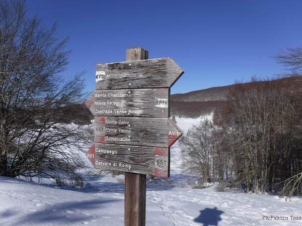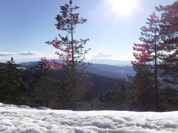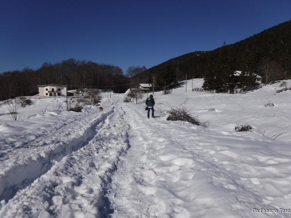Dopo la lunga pausa per le feste natalizie questo insperato sabato in zona “gialla” e’ una manna del cielo. Arrivati a Monte Livata capiamo subito che e’ una manna non solo per noi. Meta’ Roma ha preso la macchina per godersi la giornata all’aperto e buona parte e’ venuta proprio qua a Monte Livata. Volevamo andare a Campo dell’Osso per una passeggiata da quelle parti ma dopo un buon quarto d’ora in fila nel traffico (traffico, dico proprio traffico, mai vista una cosa simile!) giriamo la macchina e prendiamo per una meta meno ambita. Andiamo a parcheggiare all’inizio del sentiero che porta a Campaegli. E’ pieno di auto anche qua, ma almeno non c’e’ da fare file. Trovato parcheggio, prendiamo le nostre ciaspole e partiamo. Di neve ce n’e’ tanta, quanta non se ne vedeva da anni. Sulla strada per Campaegli la neve e’ compatta e si puo’ camminare anche senza ciaspole.