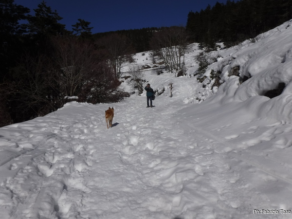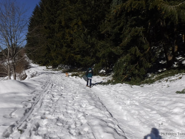 Risalire alla strada e tornare alla macchina consuma le mie ultime forze. Me ne accorgo andandomi a levare le ciaspole. Lo faccio mentre Gabriele e’ a recuperare la macchina. Al primo tentativo mi prendono dei crampi tremendi ai muscoli addominali e rimango piegato in due mentre Luna mi squadra incuriosita. Quando recupero la posizione eretta riesco a togliere le ciaspole con mosse che devono sembrare ben strane ai gitanti che passano. Al ritorno di Gabriele sono pronto a spiaccicarmi in macchina con il sollievo dei muscoli doloranti.