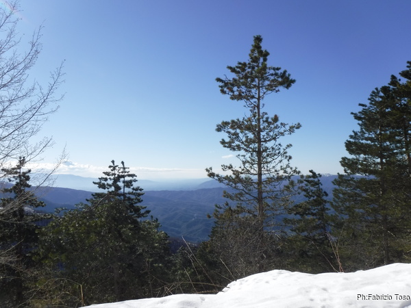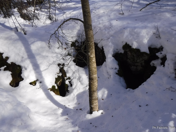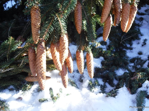 Anche stavolta pero’ la ricerca non da’ i frutti sperati. Il punto indicato dal fido GPS di Gabriele non presenta buchi di sorta. Dopo esserci aggirati inutilmente nei paraggi, decidiamo di rinunciare. Torneremo con Nerone che sa bene dove sia la grotta. Arrancando nella neve alta e morbida, anche con le ciaspole affondo parecchio, torno sulla strada. Aspettando Gabriele fotografo un gruppo di pigne che pendono da un albero caduto. Mi viene l’idea di prenderlo per portarlo a casa ma non mi sorride l’idea di camminare con un ingombro simile. Lascio perdere.