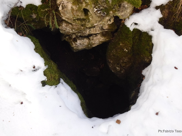 Arrivato alla grotta ho una sorpresa. E’ la stessa grotta che trovammo quasi al termine del giro fatto a novembre dello scorso anno, quando partimmo dal Volubro. Come al solito non la ricordavo per nulla. Faccio una foto all’ingresso tanto per averne una anche con la neve.
