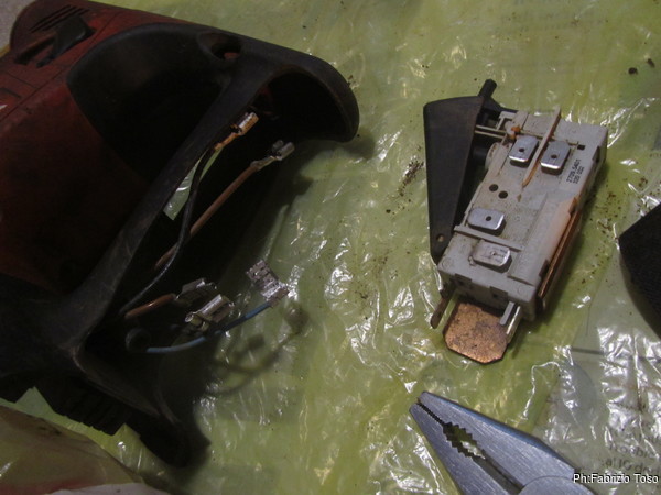 Iniziano i guai, le viti hanno la “testa” a forma di stella, necessitano di un cacciavite appropriato. Rovisto in tutta casa perche’ ricordo di averli. Li trovo. Disdetta! Sono troppo piccoli. Con un poco di fatica e un cacciavite ordinario riesco a togliere la vite che tiene al suo posto il coperchio dell’alloggio dell’interruttore del trapano.