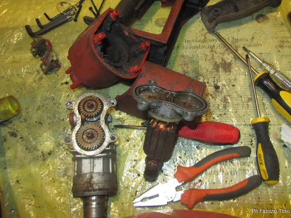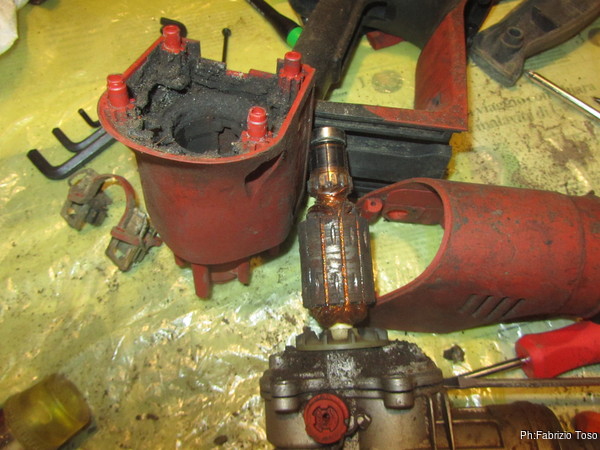 Continuo ad aprire il cuore del trapano, con cautela e fatica perche’ sembra incollato, tolgo il rotore (credo di chiami cosi’) del motore, quello che contiene l’avvolgimento di fili di rame.