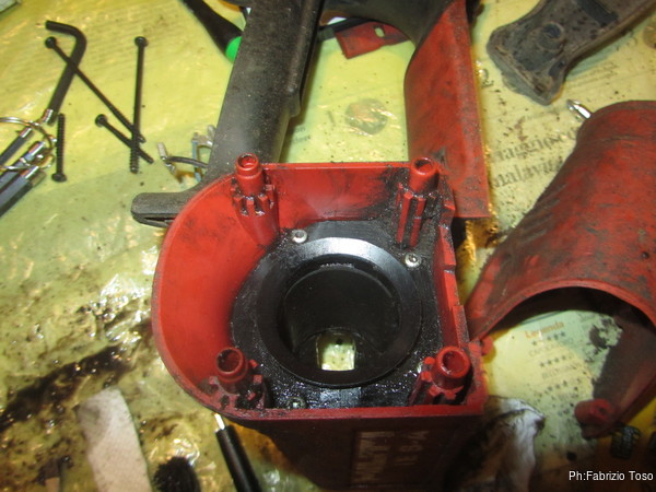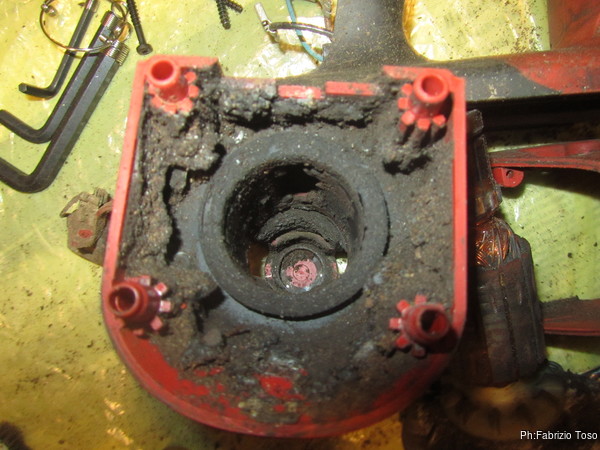 La sede del rotore, dove ci sono i magneti e’ invasa da una sostanza nera e appiccicosa. Dalla sporcizia accumulata riesco a capire come mai il trapano risultasse bloccato.