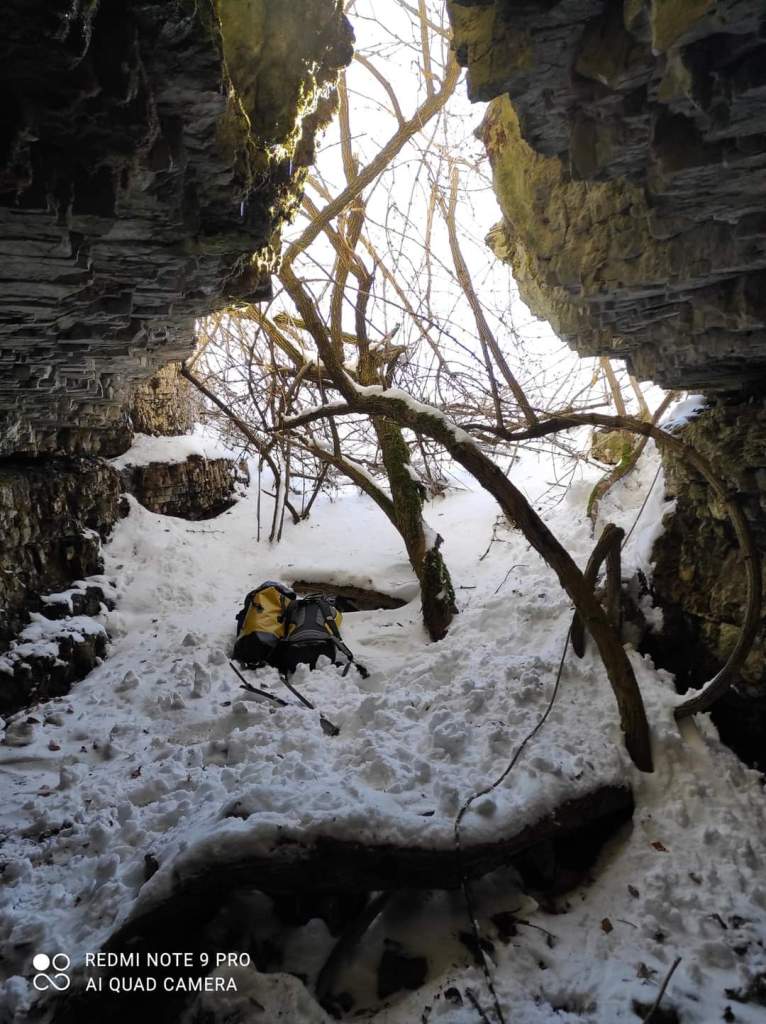 Mentre Valentina e Claudio si cambiano mi faccio prendere dalla curiosita’ di vedere la grotta. Rubo di mano la corda a Gabriele e vado a sistemarla. Scendo la prima parte della dolina dove la pendenza e’ meno forte, non c’e’ neve in quel punto e in compenso ci sono delle rocce affioranti dove magari posso fissare la corda. Ho poca fortuna con la prima roccia. E’ completamente distaccata dal resto e devo farla cadere prima che decida di farlo in autonomia mentre ci siamo sotto noi. Una volta eliminato il pericolo incombente (l’ho “incombuto” come diceva sempre mia zia per prenderci in giro), trovo un’altra roccia dove mettere la corda e mi calo. Entro in uno sgrottamento in fondo alla dolina, mi giro a guardare da dove sono venuto e urlo ai miei amici che se vogliono possono scendere.